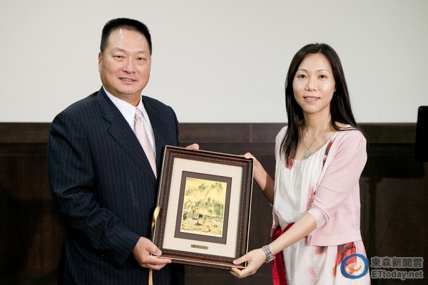 東森總裁王令麟(左)致贈(zèng)郎世寧畫作「八峻圖」給來(lái)訪的廈門市商務(wù)局副局長(zhǎng)鄭耀。(圖/ETtoday)