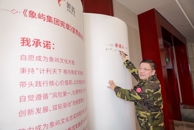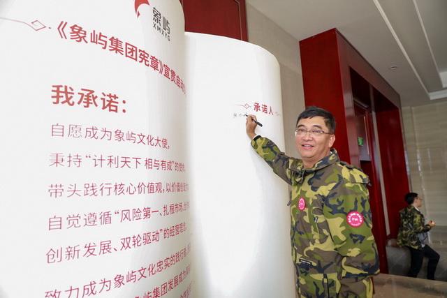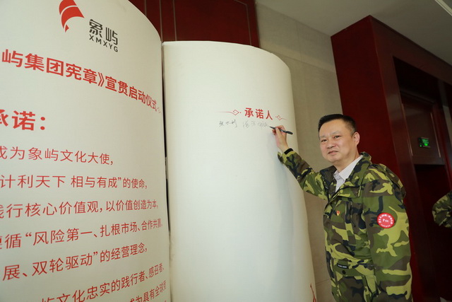 在《象嶼集團(tuán)憲章》宣貫啟動(dòng)儀式上,121名象嶼文化大使鄭重承諾:“我自愿成為象嶼文化大使,秉持‘計(jì)利天下 相與有成’的使命,帶頭踐行核心價(jià)值觀,以價(jià)值創(chuàng)造為本,自覺遵循‘風(fēng)險(xiǎn)第一、扎根市場(chǎng)、合作共贏、創(chuàng)新發(fā)展、雙輪驅(qū)動(dòng)’的經(jīng)營(yíng)理念,致力成為象嶼文化忠實(shí)的踐行者、感召者、傳播者,為把象嶼集團(tuán)發(fā)展成為具有全球競(jìng)爭(zhēng)力、以供應(yīng)鏈為核心的綜合性投資控股集團(tuán)而努力奮斗!”