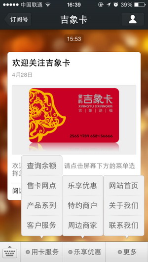1、增加微信菜單功能,方便用戶使用吉象卡的各項服務(wù),如查詢吉象卡余額、查看周邊商家等;