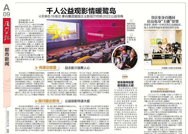 把關(guān)愛送到需要的人身邊。象嶼集團(tuán)的公益之心也在影響著廈門青少年。在廈門外國語學(xué)校湖里分校專場,近60位師生共同觀看了《奇跡·笨小孩》。“對學(xué)生來說,收獲的不僅是影片主人公永不言棄的精神,還有國企開展公益活動體現(xiàn)的社會責(zé)任感。象嶼集團(tuán)的擔(dān)當(dāng)精神對孩子們的成長具有教育意義。”廈門外國語學(xué)校湖里分校德育主任薛麗清告訴記者,學(xué)校和象嶼集團(tuán)是“近鄰黨建”共建單位,多年來象嶼集團(tuán)不僅捐資助力校園文化設(shè)施改造,還為學(xué)生提供公益觀影、愛心植樹、象棋嘉年華等成長平臺,助力孩子們健康成長。
